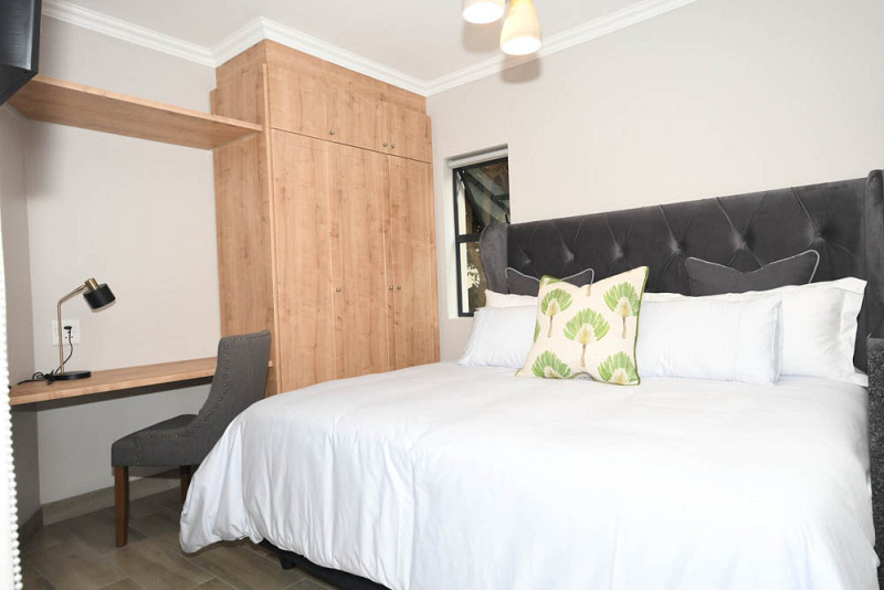 Small, but comfortable, this modern Studio sleeps two in the king-size bed and has all that one really needs – ample cupboard space, a small desk, bar-counter for breakfasts, fully-stocked kitchenette, bathroom with shower and a private courtyard.